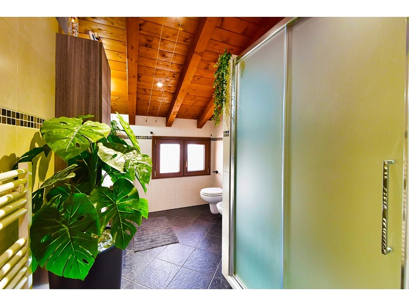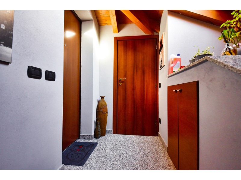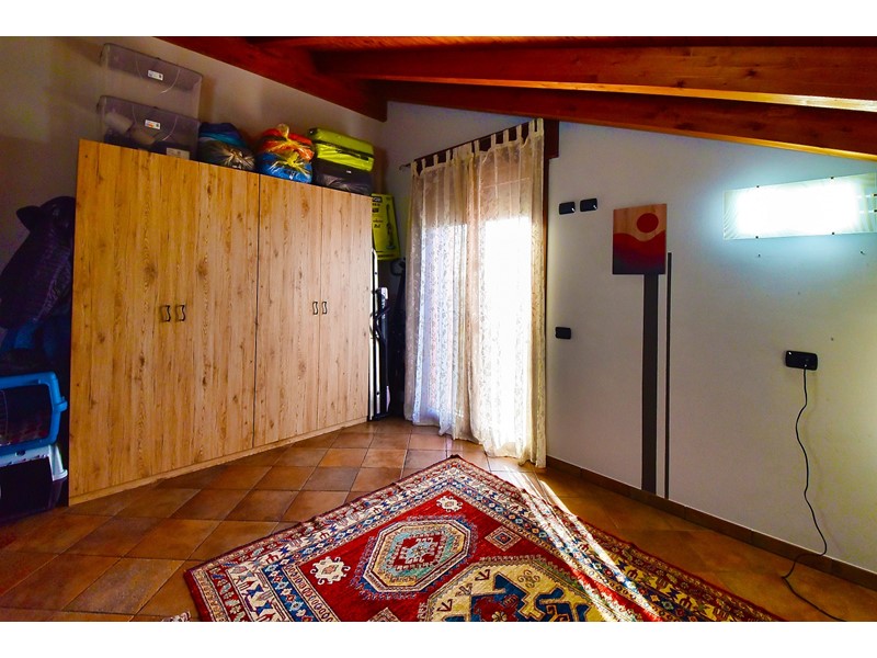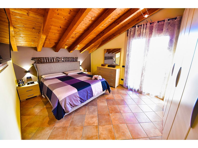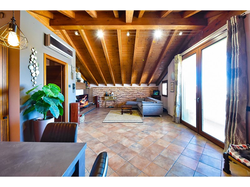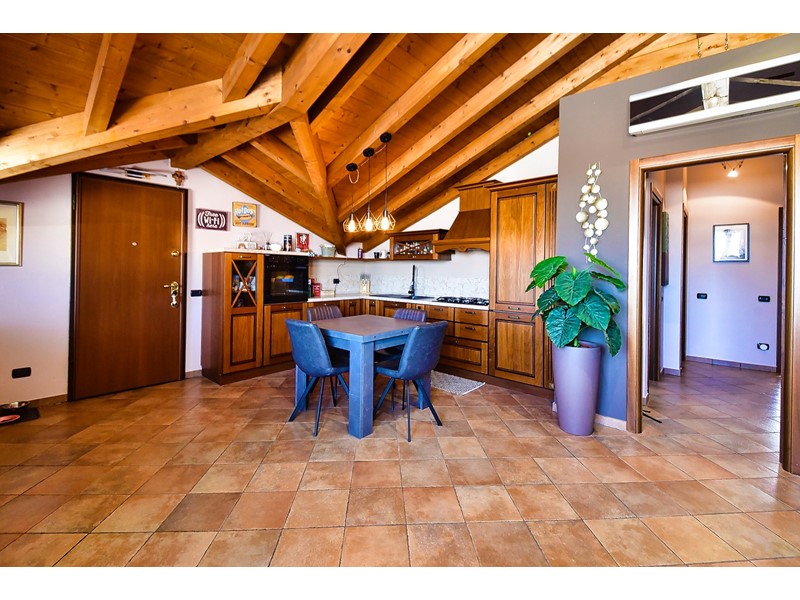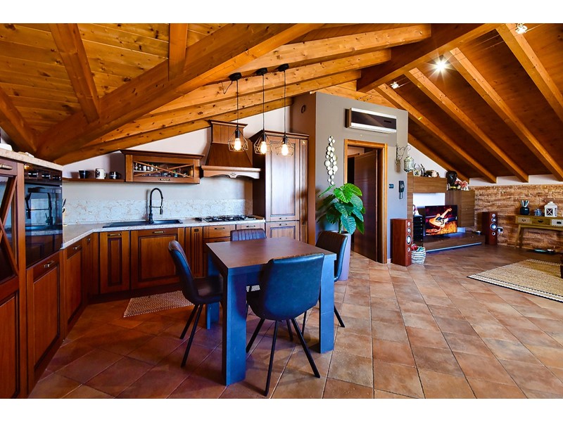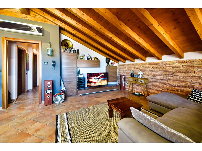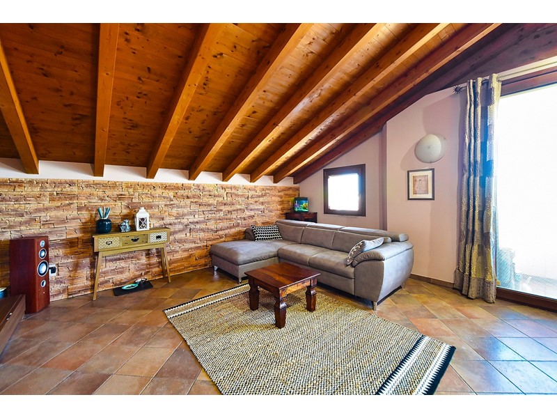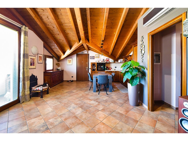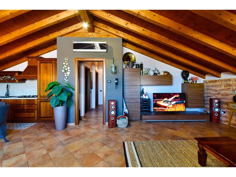 Le travi a vista rendono particolarmente accogliente la soluzione che è libera su quattro lati ed è così composta: ingresso nell’ ampio salone con cucina a vista e accesso al balcone esposto a sud; attraverso il disimpegno accediamo alla zona notte che comprende due comode camere da letto, uno studio e il bagno con doccia.