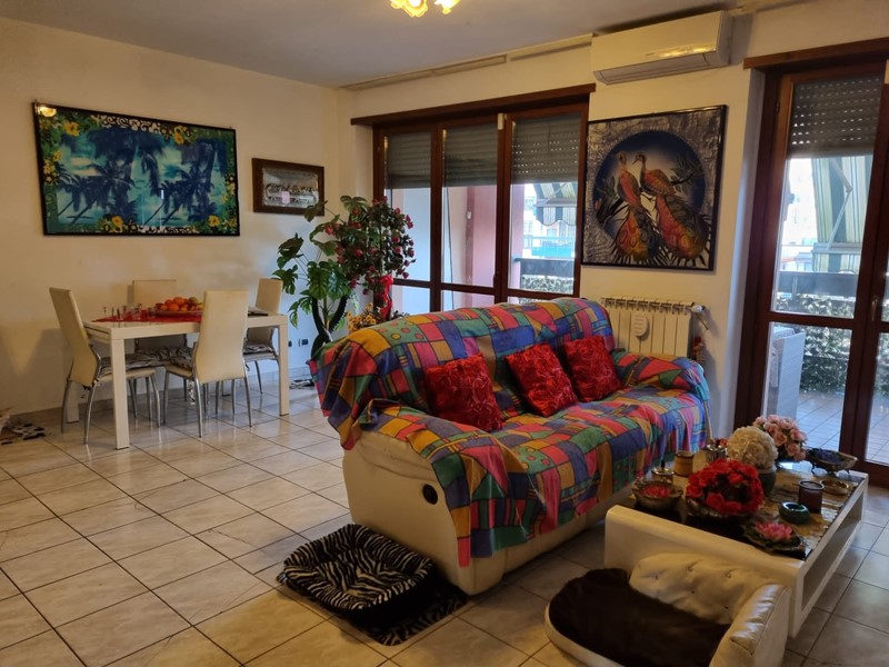 Gli infissi sono in pvc doppio vetro effetto legno, presenza nella stanza e in soggiorno dell'aria condizionata con funzione inverter.